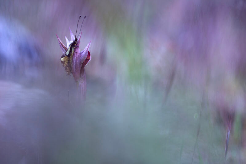 Les ascalaphes sont inféodés aux milieux ouverts bien exposés. Cet ascalaphe soufré est posé sur une orchidée du genre Serapias. Ces orchidées sont assez communes sur mes « spots » à ascalaphe.