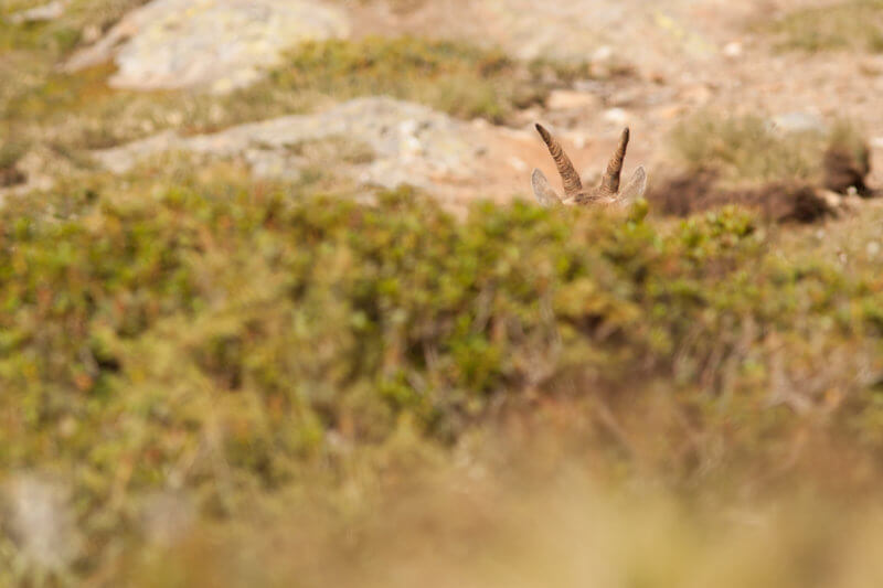 Le pelage des bouquetins se confond très bien avec la couleur des pierres, si bien que nous avons failli marcher sur cette femelle qui était étalée en plein milieu du chemin de randonnée. Nous avons été aussi surpris qu’elle lorsqu’elle s’est levée d’un coup en poussant un cri d’alerte, se rendant compte que nous nous rapprochions de plus en plus. Une fois chacun remis de ses émotions, cette femelle est retournée à sa tranquillité en s’éloignant un peu du chemin.