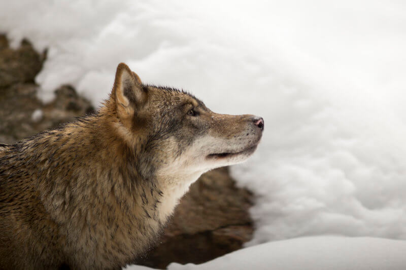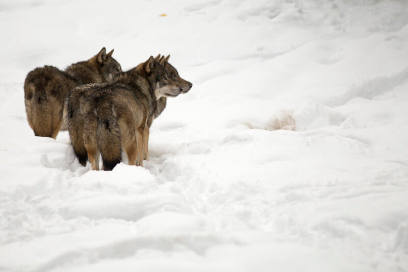 Ce loup observe le couple dominant en train de se nourrir. Il se tient à distance des morceaux de viandes, déposés par les soigneurs du parc, en attendant son tour.